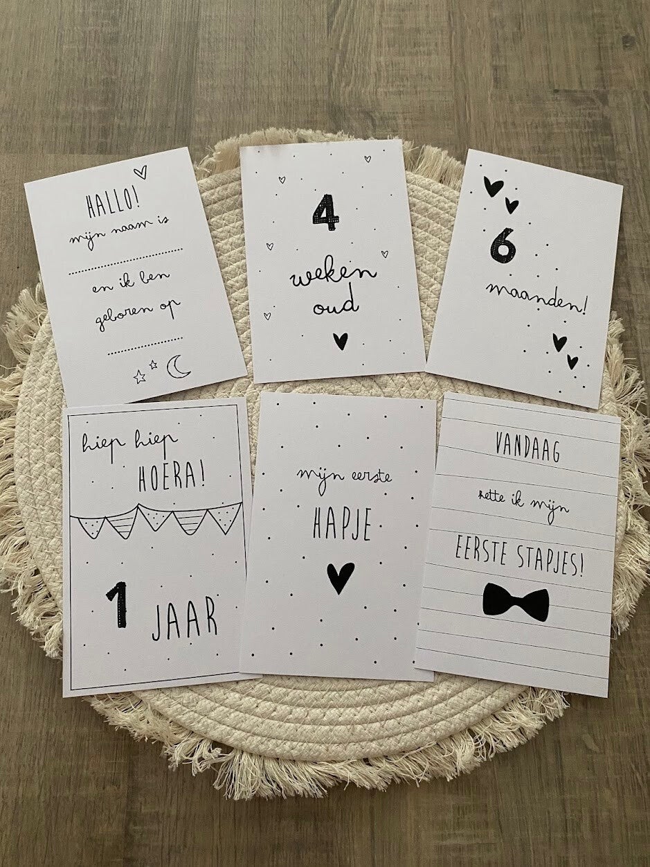 De mijlpaalkaarten leg je neer bij je baby op het moment dat hij of zij een bepaalde leeftijd of mijlpaal bereikt heeft.