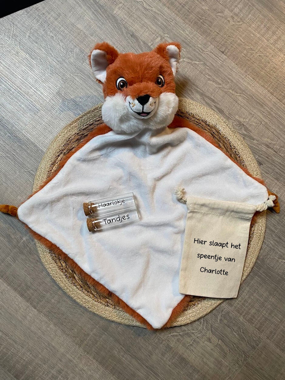 Ook zitten er twee kleine buisjes bij voor een haarlokje en de allereerste tandjes. En natuurlijk mag een persoonlijk naamzakje niet ontbreken… want echte vosjes verliezen nooit hun spulletjes!