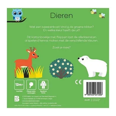 Wat een beestenboel! Vind jij de groene kikker? En welke kleur heeft de uil? Dit kartonboekje met flappen laat de allerkleinsten al spelend kennis maken met de verschillende kleuren. Zoek je mee?