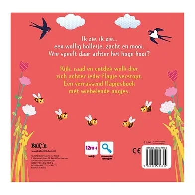 Ik zie, ik zie… een wollig bolletje, zacht en mooi. Wie speelt daar achter het hoge hooi? Een verrassend flapjesboek mét wiebelende oogjes. Het klassieke spelletje ‘Ik zie, ik zie’ in een nieuw jasje. Het is aan het kind om te raden welk boerderijdier er door de flapjes komt piepen. De prachtige illustraties baden in een fris, aantrekkelijk kleurenpalet dat de beleving totaal maakt.